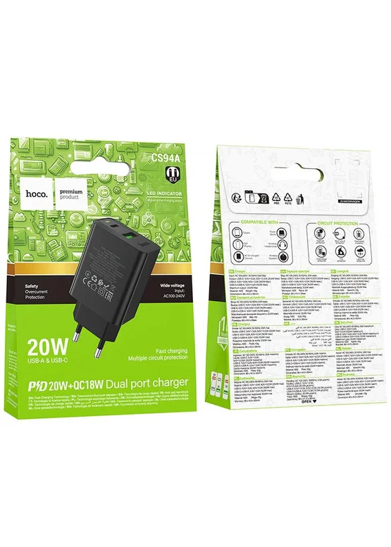 СЗУ Hoco CS94A Leader PD20W+QC3.0 (1USB-A/1C) Black