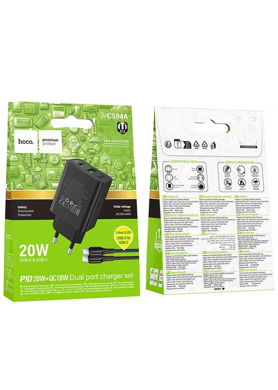 СЗУ Hoco CS94A Leader PD20W+QC3.0 (1USB-A/1C) + кабель Type-C to Type-C Black