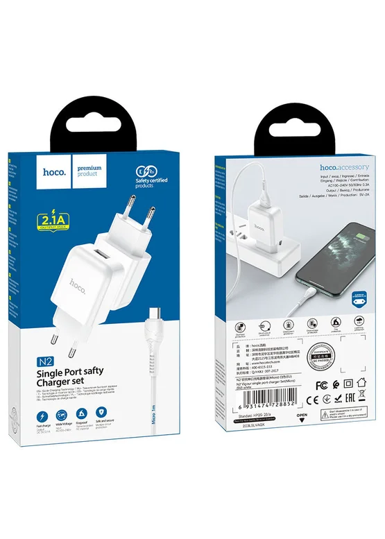 СЗУ HOCO N2 (1USB/2.1A) + USB - MicroUSB Белый