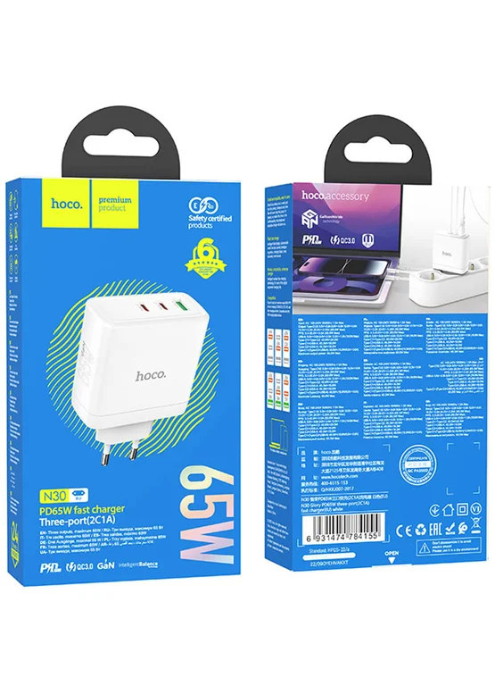 СЗУ Hoco N30 Glory PD65W (2Type-C/1USB) White