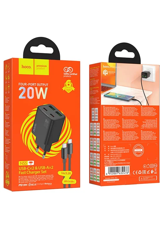 СЗУ Hoco N55 Fundador PD20W four-port (2USB-A/2C) + Type-C to Type-C Black