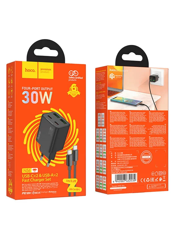 СЗУ Hoco N56 Fundador PD30W four-port (2USB-A/2C) + кабель Type-C to Type-C Black
