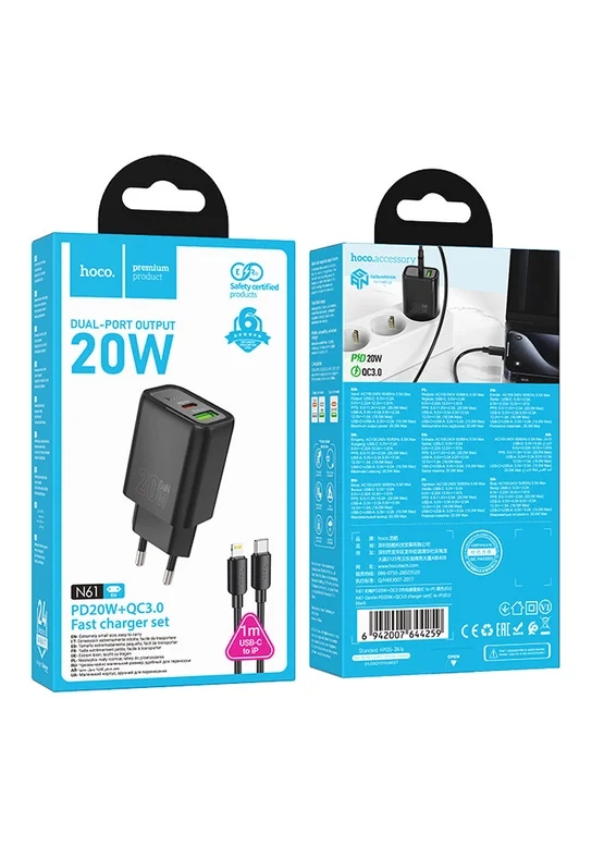 СЗУ Hoco N61 Gentle PD20W+QC3.0 (1USB-A/1C) + кабель Type-C to Lightning