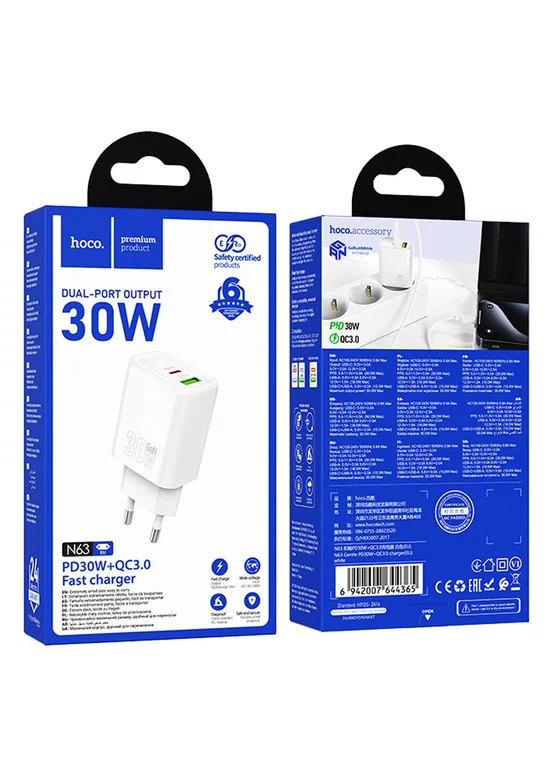 СЗУ Hoco N63 Gentle PD30W+QC3.0 (1USB-A/1C)