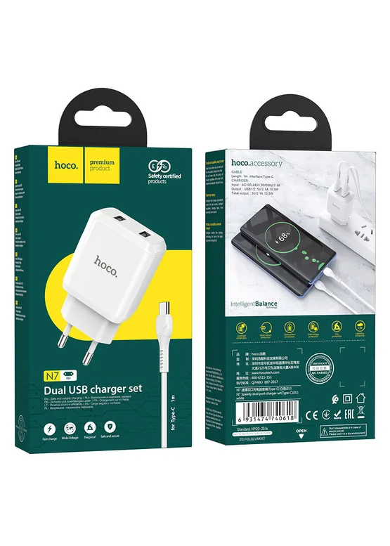 СЗУ HOCO N7 (2USB/2,1A) + USB - Type-C Белый