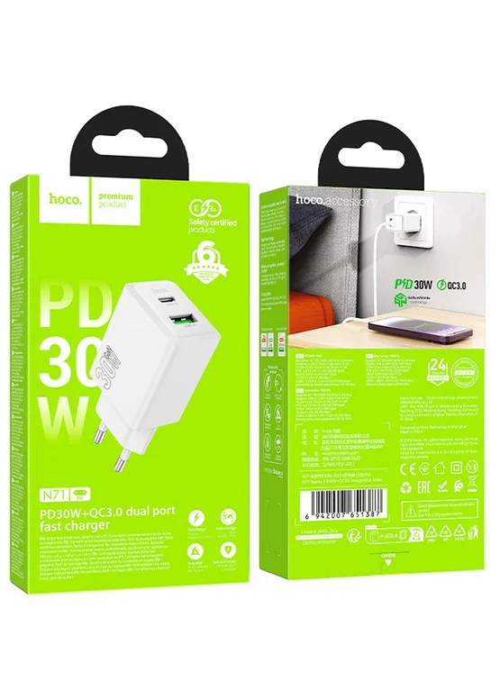 СЗУ Hoco N71 Nuevo PD30W+QC3.0 (1USB-A/1C) White