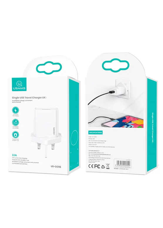 СЗУ USAMS US-CC116 T18 Single USB Travel Charger (UK Plug) Белый