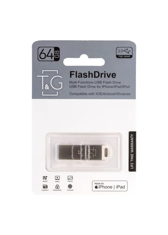 Флеш-драйв T&G 008 Metal series USB 3.0 - Lightning 64GB Серебряный