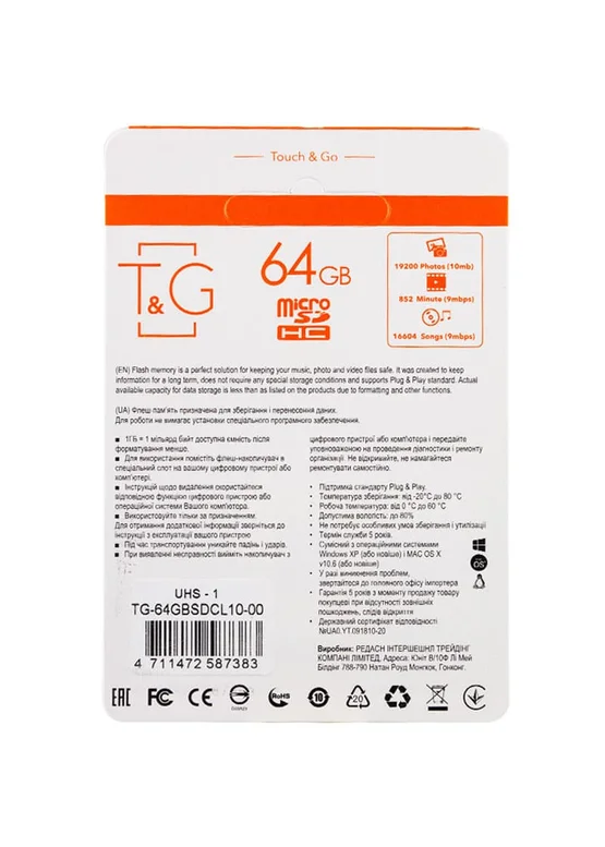Карта памяти T&G microSDXC (UHS-1) 64 GB class 10 (без адаптера) (Черный)