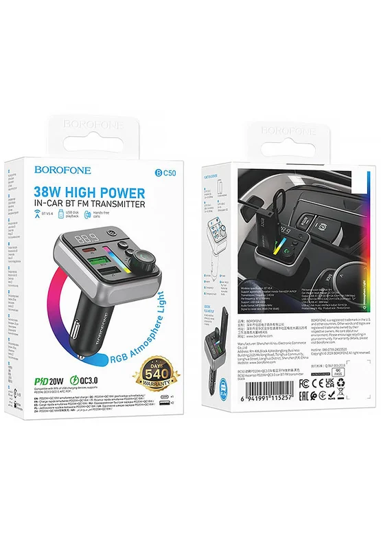 АЗУ FM модулятор Borofone BC50 Ascenso PD20W+QC3.0 18W (2USB-A/1C)