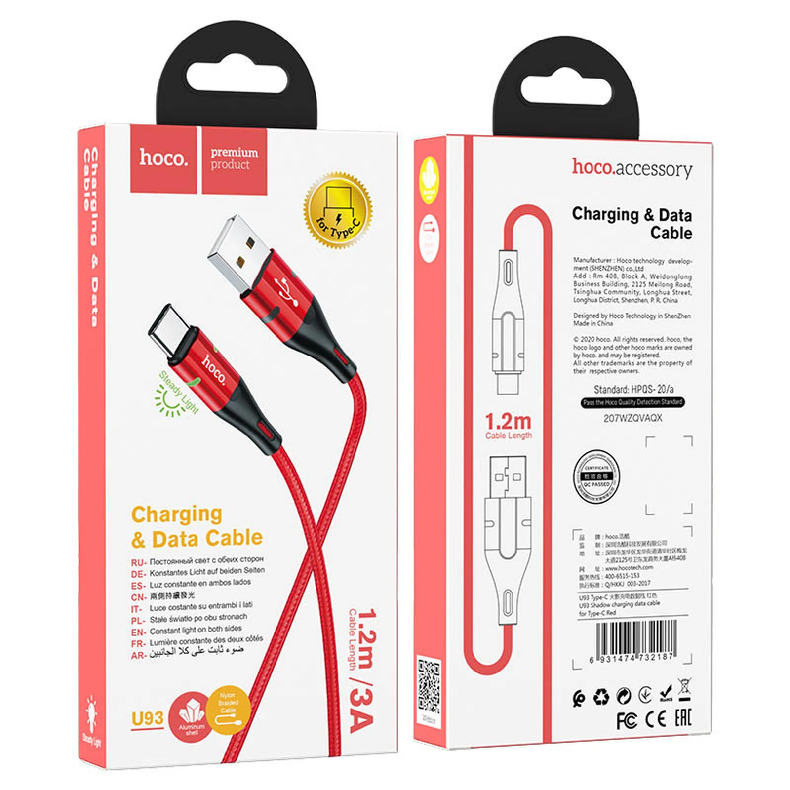 Дата кабель Hoco U93 "Shadow" Type-C (1.2 m) (Червоний)