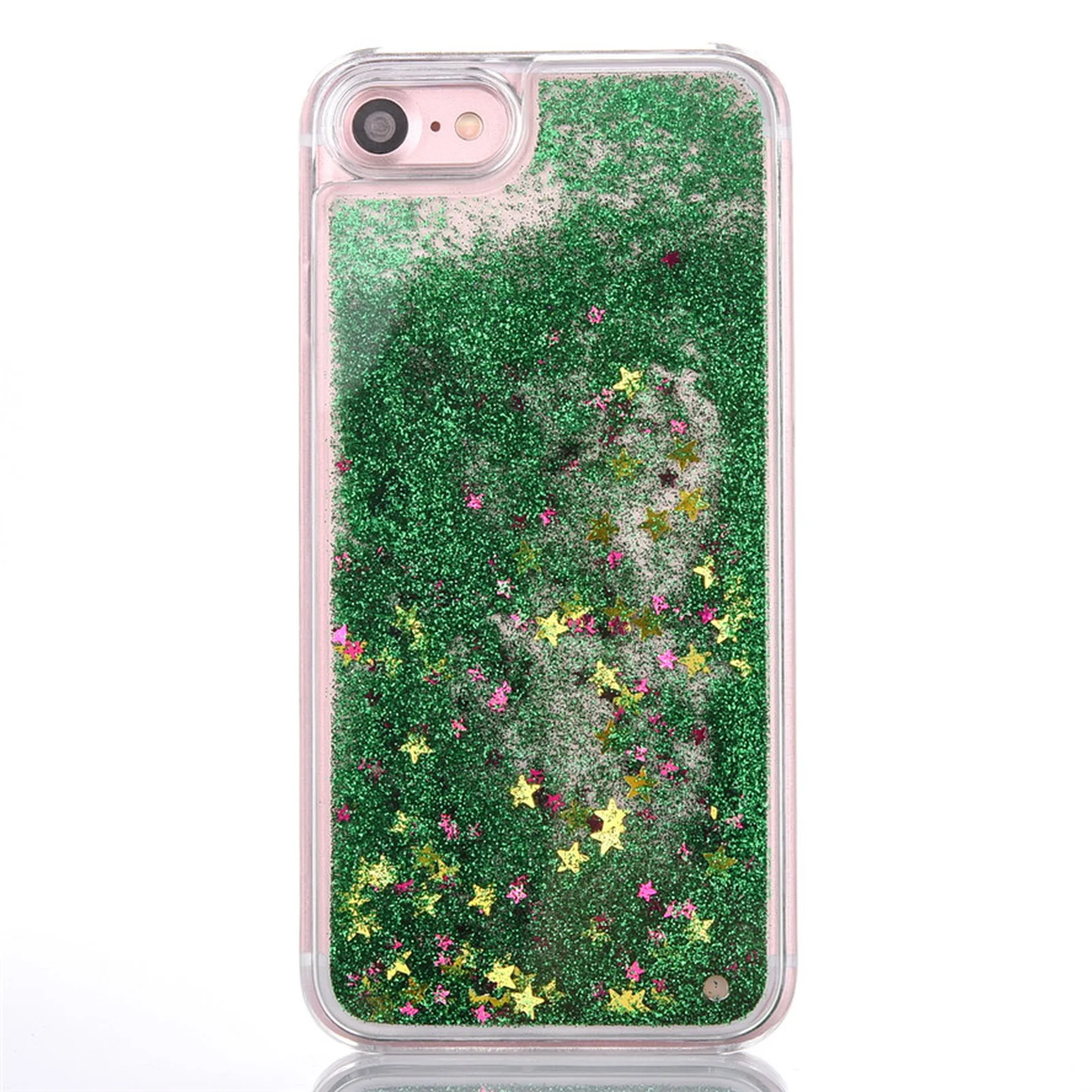 Прозорий пластиковий чохол, для iPhone 7 який, буде захищати Ваш смартфон, і служити аксесуаром для Вашого образу. Усередині чохла ніжно переливаються, створюючи різні форми, яскраві блиски і зірочки. Зелений колір завжди піднімає настрій, допомагає в роботі і підходить до всього як прикраса. Так само чохол захистить Ваш смартфон від абсолютно будь-яких механічних пошкоджень і на багато років продовжить життя Вашого iPhone.
