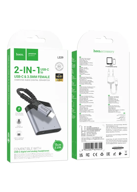 Перехідник Hoco LS39 Type-C to Type-C + 3.5mm Metal gray