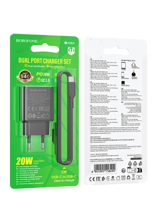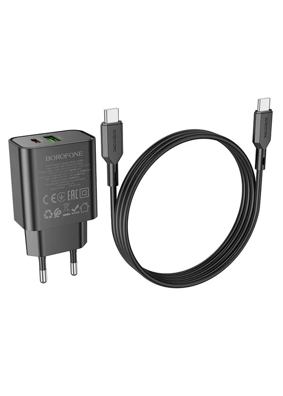 СЗУ Borofone BA88A Navy PD20W+QC3.0 (1USB-A/1C) + кабель Type-C to Type-C Black