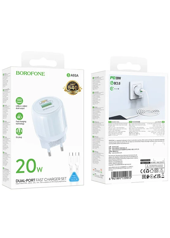 СЗУ Borofone BA93A Lustrous PD20W+QC3.0 (1USB-A/1C) + кабель Type-C to Type-C Blue